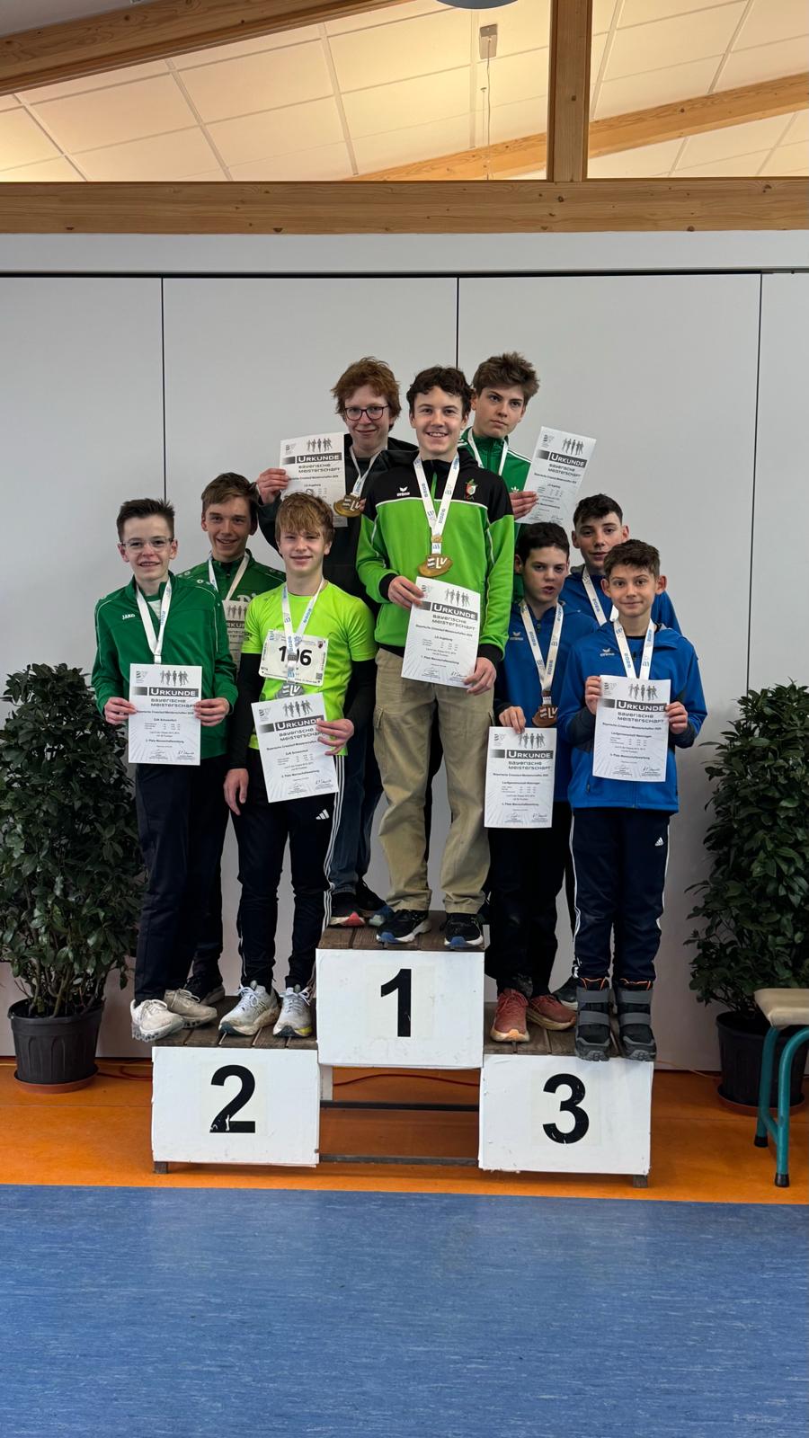 Unsere U16-Athleten Julian, Toni und Tim überzeugten bei der Bayerischen Crosslaufmeisterschaft mit starken Leistungen und wurden dafür mit dem Bayerischen Mannschaftstitel belohnt.